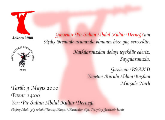 PSAKD Gaziemir Şubesi Açılış EtkinliğiPir Sultan Abdal Kültür Derneği Gaziemir Şubesi, 9 Mayıs Pazar günü dernek binasında düzenlenecek...