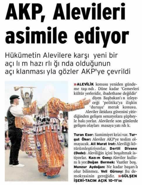 Seçim sürecinde yürüttüğü çalışmalarına bakıldığında alevi cemaatini ilgilendiren hiçbir olumlu bir düşüncesi bulunmayan AKP bugün AB'nin baskıları sonucu Alevilerle yakınlaşmaya çalışıyor. Geçmişe dönüp baktığımızda başbakanın belediye başkanlığı döneminde Karacaahmet Cemevi'ni ortadan kaldırmak istemesi daha dün gibi hafızalardadır. Aleviler Diyanet İşleri'yle yakınlaştırılmak istenmektedir. Oysa ki Diyanet İşleri Cumhuriyet rejimine inanmayan bir kurumdur.