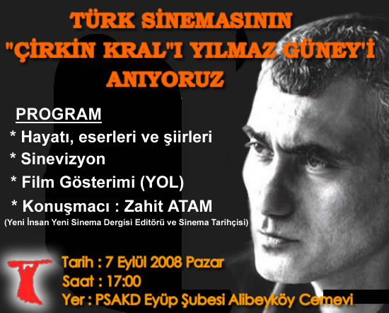 TÜRK SİNEMASININ "ÇİRKİN KRAL"I YILMAZ GÜNEY'İ ANIYORUZPROGRAM:* Hayatı, eserleri ve şiirleri* Sinevizyon * Film Gösterimi...