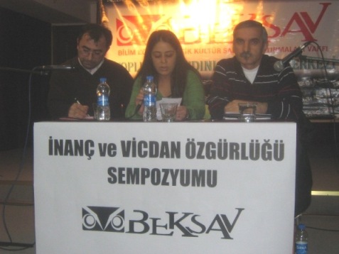 (AHA Özel Haber) 22 Mart 2008 Cumartesi günü saat 13:00'te BEKSAV (Bilim Eğitim Estetik Kültür Sanat Araştırmaları Vakfı ) Konferans salonunda gerçekleştirilen İnanç ve Vicdan Özgürluğü Sempozyumu'na Türban tartışmaları damgasını vurdu. BEKSAV tarafından organize edilen sempozyum 3 oturum halinde gerçekleştirildi. "Aleviler ve Resmi İdeoloji", "Türban ve Sosyalizm" ve "Gayri-müslim Azınlıklar ve Türk İslam Sentezi" olarak belirlenen oturum başlıklarında konuşmalar yapıldı. "Aleviler ve Resmi İdeoloji" başlığında PSAKD Kültür Sanat Sekreteri Erdal YILDIRIM ve Atılım Gazetesi Yazarı Halil DİNÇ yirmişer dakikalık birer konuşma yaptılar. "Türban ve Sosyalizm" başlıklı oturumda ise Gazeteci - Yazar Mukaddes ÇELİK birer sunum gerçekleştirdi. "Gayri-müslim Azınlıklar ve Türk İslam Sentezi" başlıklı son oturumda ise Belge Yayınları Sahibi - Yazar Ragıp ZARAKOLU bir konuşma yaptı. Sempozyumda bir konuşma yapması beklenen Yazar Sevim BELLİ ve TESEV Yönetim Kurulu Üyesi Osman KAVALA rahatsızlıkları nedeniyle sempozyuma katılamadılar.