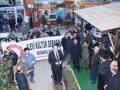 Geçtiğimiz gece Hasanbey Mahallesi Şehit Osman Sokakta bulunan Alevi Kültür Dernekleri Mudanya Şubesine yapılan taşlı saldırıda kapı camının kırılmasına neden olan olayı kınamak için Alevi Derneği Mudanya Şubesi ve Mudanya Demokrasi Güçleri adı altında çeşitli siyasi partiler ve dernekler Halitpaşa caddesindeki parkta basın açıklaması yaptılar.