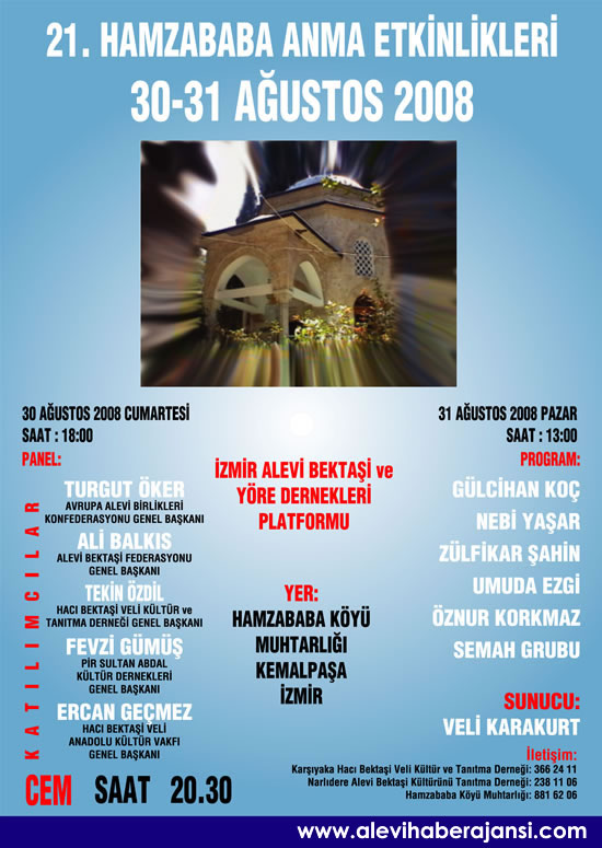 21. HAMZA BABA ANMA ETKİNLİKLERİ30-31 AĞUSTOS 2008 HAMZABABA KÖYÜ - KEMALPAŞA / İZMİR30 AĞUSTOS 2008 CUMARTESİ - I.GÜNSAAT: 18:00PANEL:...