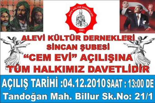 Alevi Kültür Dernekleri Sincan Şubesi Cem Evi AçılıyorAçılış Tarihi : 04 Aralık 2010 CumartesiSaat : 13.00 Adres : Tandoğan Mahallesi...