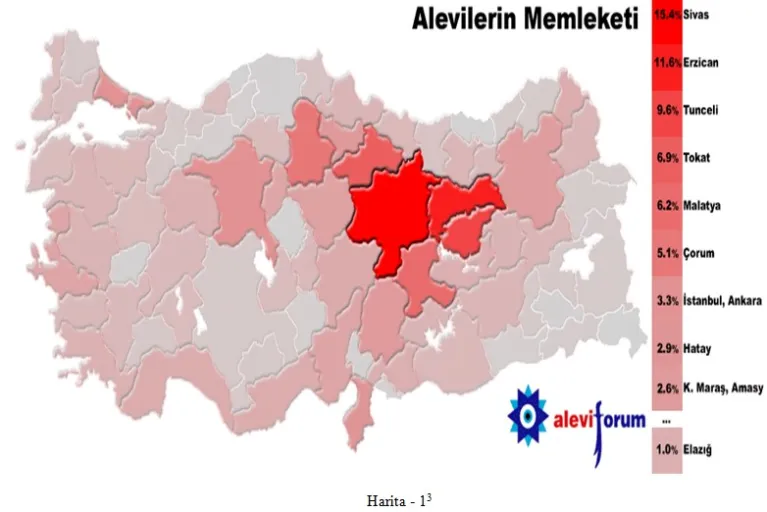Not: bu harita şu an belirtilen illerde yaşayan Alevileri GÖSTERMEMEKTEDİR. Şu an çoğu farklı illerde yaşamalarına rağmen köken “memleket” olarak Alevilerin yaklaşık tahmini oranları belirtilmektedir.