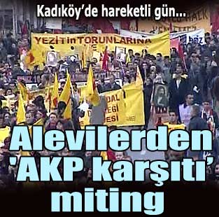 Pir Sultan Abdal Kültür Derneği’nin öncülüğünde Kadıköy İskele Meydanı’nda toplanan Aleviler, AKP’nin “Alevi Açılımı”nı protesto etti. Yaklaşık 15 bin kişinin katıldığı mitingde konuşan Pir Sultan Abdal Kültür Derneği Genel Başkanı Kazım Genç, AKP’nin Alevilere yönelik de hiçbir olumlu politikası olmadığını belirtti. Genç, “AKP’nin Alevilere yönelik tek politikası asimilasyondur, inkardır. Çünkü biz şeriata karşı duruyoruz” dedi.