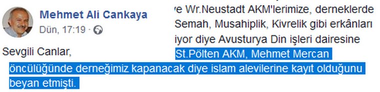Avusturyadaki ''İslamcı Aleviler'' diye tanımladığınız kişi ve kurumlarla yaşadığınız kopma sürecinde negatif bazda ciddi bir rolü olduğunu iddia ettiğiniz ve ilgili şahıs hakkında yatay şekilde dillendirdiğiniz çok ciddi itham ve iddialarda bulunduğunuz M. Mercan isimli şahsı yukarıdaki son bir açıklamasında Mehmet Ali Çankaya temize çıkarır bir söylem geliştirme ihtiyacını neden duymuştur?