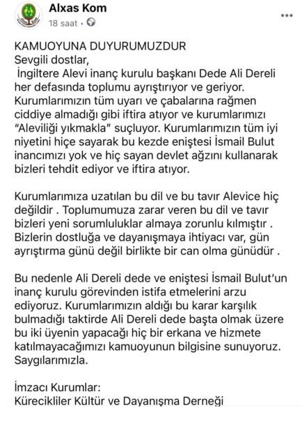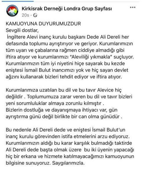 Tartışma sürerken, kongre sonrasında Ali Dereli'nin eniştesi olan İsmail Bulut’un yöresel dernekleri hedef alması ise tansiyonu yükseltti. Enişte Bulut’un yöresel derneklerin gençleri Aleviliğe karşı düşmanlık ettiklerini iddia ederek, “Türkiye’de Alevi inancını yok sayan Türk ve Kürt örgütleri 1970 yılından beri gençlerimizi inancımıza, yolumuza ve pirlerimize düşman ettiler. Bu görevi Britanya’da köy ve yöre dernekleri üstlenmiş!” dediği ileri sürüldü.