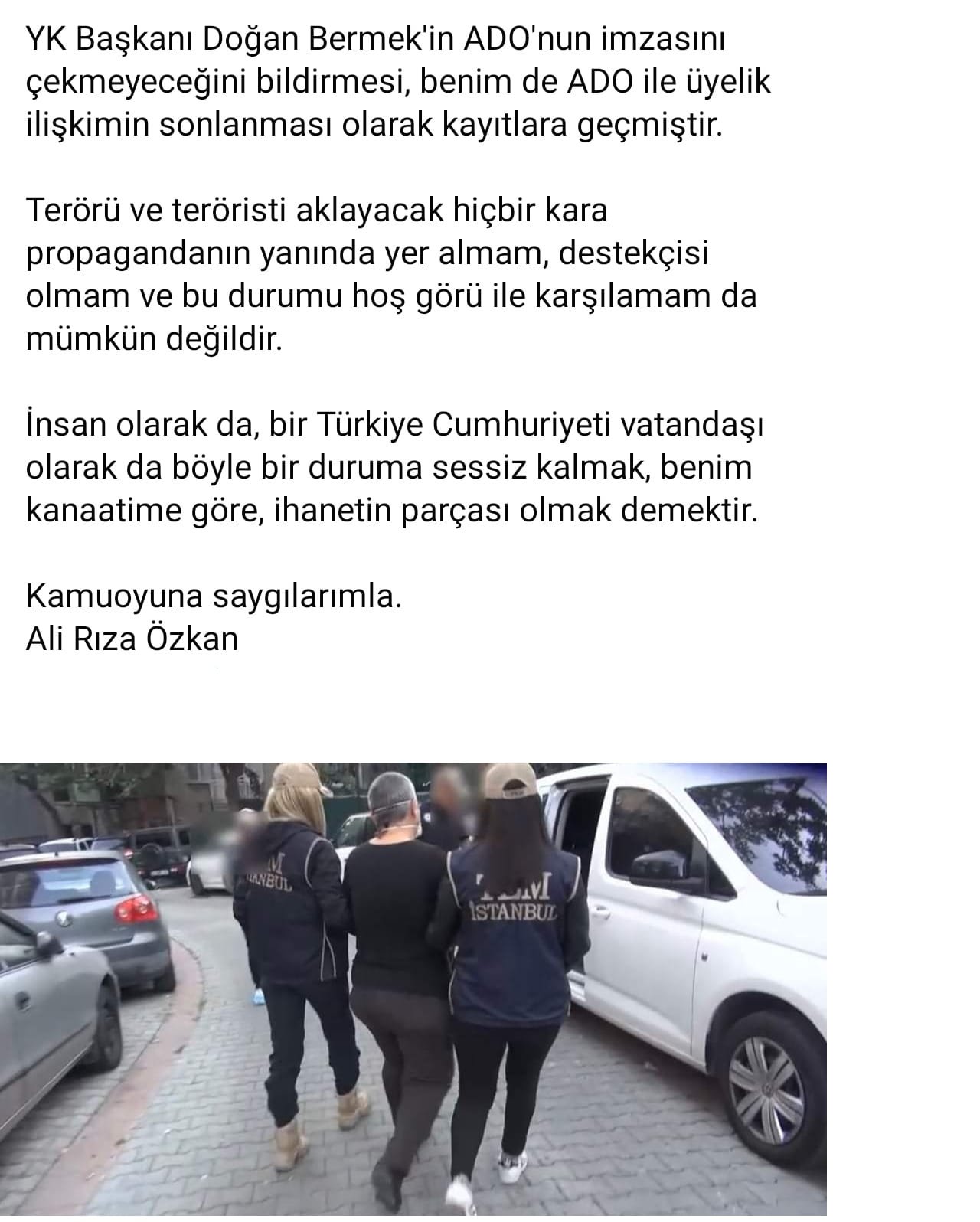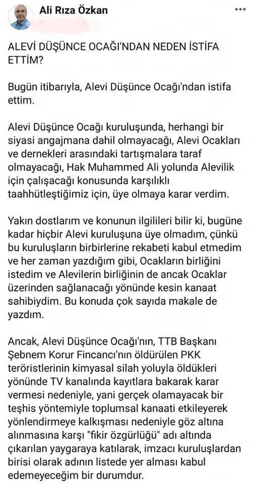 Devrimci, Demokrat, ilerici, yurtsever, laik, özgürlükçü tüm Alevi oluşum ve bireylerin azılı düşmanı olarak tanınan ve fişleme ve ihbarcılık gibi ayak işlerinin maaşsız elemanı Ali Rıza Özkan bu kez faşistlik çukurunun dibinide delerek keyfi tutuklama, gözaltılar ile tüm muhalifleri sindirme politikalarını sürdüren AKP/MHP/İP ortakların TTB Başkanı sayın Şebnem Korur Fincancı'nın önce gözaltı sonra ise tutuklanması sürecini eleştiren Alevi Düşünce Ocağı isimli sağcı islamcı yapılanmadan istifa ettiğini duyurdu.