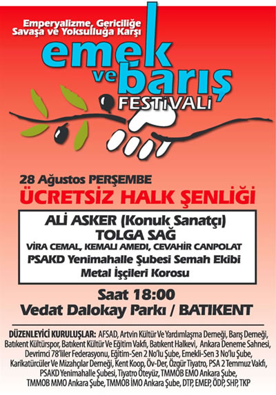 ANKARA (Cumhuriyet Bürosu) - Batıkent, 6 gün boyunca çeşitli sergilerin açılacağı, konserlerin verileceği ve panellerin düzenleneceği “Emperyalizme, Gericiliğe, Savaşa ve Yoksulluğa Karşı Emek ve Barış Festivali”ne ev sahipliği yapacak. Pek çok sivil toplum örgütünün bir araya gelerek başlattıkları festival, yurttaşları eğlendirmenin yanı sıra Anakent Belediye Başkanı Melih Gökçek’in “keyfi” uygulamalarına da dikkat çekmeyi amaçlıyor. Bugün başlayan festivalin konukları arasında Türk Halk Müziği sanatçıları Tolga Sağ ve Ali Asker de bulunuyor.