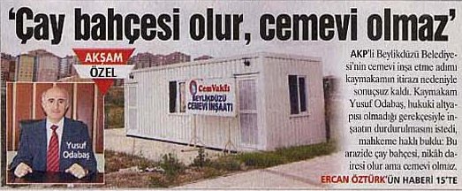 Hükümetin Alevi, Kürt ve Roman açılımları son sürat devam ederken Beylikdüzü Kaymakamı çok tartışılacak bir dava açtı. Kaymakam Yusuf Odabaş, bir önceki belediyenin meclis kararıyla yapımına başladığı Cem ve Kültür Evi projesinin 'hukuki altyapısı olmadığı' gerekçesiyle inşaatın durdurulması için mahkemeye başvurdu.