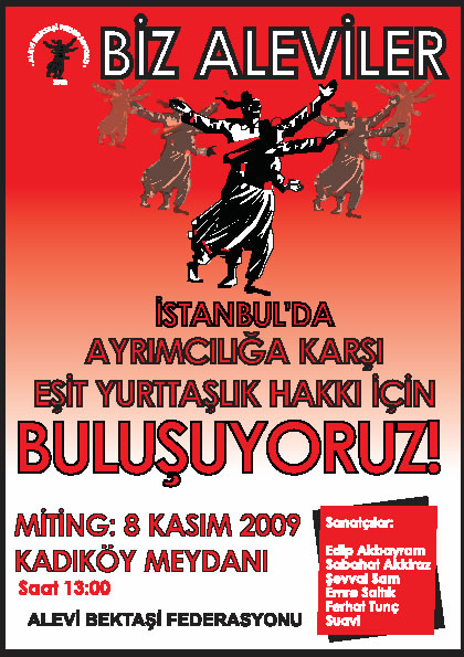 İSTANBUL (31.10.2009)- Büyük Alevi Mitingi'ne sayılı zaman kaldı. Alevi Bektaşi Federasyonu 8 Kasımda Kadıköy' de düzenleyeceği “Ayırımcılığa Karşı Eşit Yurttaşlık Hakkı” mitingi için Kadıköy İskele Meydanı'nında bildiri dağıttı.