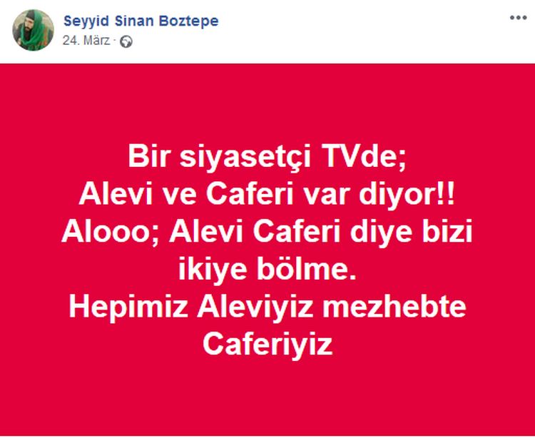 Sonuç, şimdi bir metre kara sakal bırakan, cübbe giyen, tümüyle Şii bir imam olan, halkın parasını çarpan, bu konuda Cem Vakfı’yla mahkemelik de olan Sinan Boztepe Alevi toplumunu yozlaştıran, asimile edenlerin başında yer alıyor''