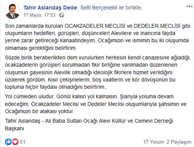 Ali Baba Sultan Ocağı Dedelerinden Tahir Aslandaş sosyal medya hesabından bir açıklama yaparak isminin bulunduğu Ocakzadeler Meclisini eleştirip ayrıldığını duyurdu.