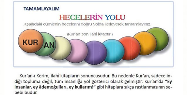 Aynı bölümün sonunda öğrencilere “Kur’an son ilahi kitaptır” diye heceleme yaptırılıyor.