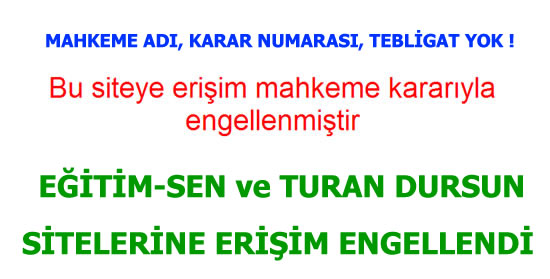 Site erişimi yasaklarına Eğitim Sen ve Turan Dursun internet siteleride eklendi. Bugün Eğitim Sen’in internet adresi www.egitimsen.org.tr ve Turan Dursun internet sitesi www.turandursun.com a girmek isteyenler BU SİTEYE ERİŞİM MAHKEME KARARIYLA ENGELLENMİŞTİR yazısıyla karşılaştılar.