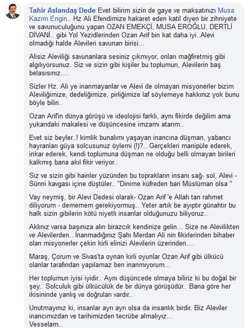 Ozan Arifin ölmesi vesilesiyle Tahir Bey ağzındaki Baklayıda çıkarıverdi. Başsağlığı dileyip, kendisini ayıplayan ve eleştiren Alevilere saldırdı.