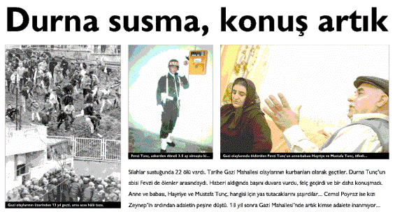 Durna susma, konuş artıkSilahlar sustuğunda 22 ölü vardı. Tarihe Gazi Mahallesi olaylarının kurbanları olarak geçtiler. Durna Tunç’un abisi Fevzi de...