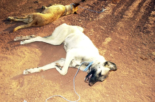 Bazı sokak köpekleri öldürülmüş olarak yerde yatıyor, bazıları ise yanan çöplüğün içinde yanıyordu.
