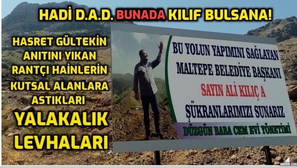 Hasret Gültekin anıtını yıkan hainlerin 'kutsallık' argümanlarının sadece bir savunma taktiği olduğunu herkes görsün. Maltepe Cemevini Alevilerin elinden alan Ali Kılıç'a yalakalık levhası Düzgün Baba dağında sorunsuz yerini almış.