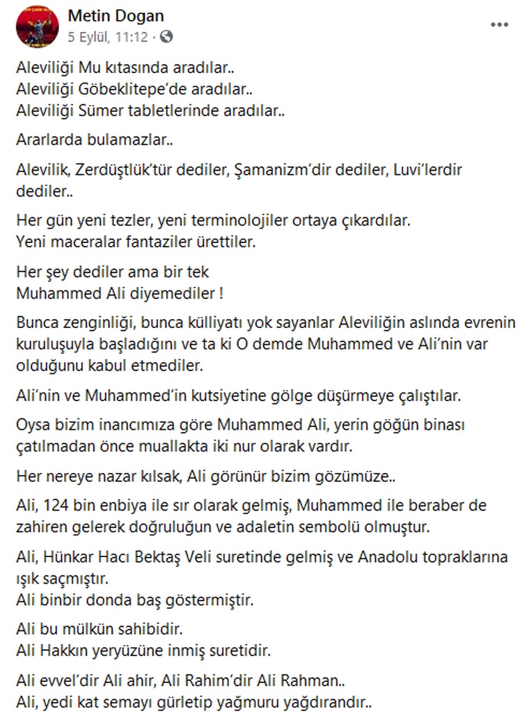 Haber sitemizin editörleri ve gönüllü muhabirlerimiz Alevi hak mücadelesi veya misyonerlik çalışması içinde aktif birçok insanın olduğu gibi Metin Doğan'ın sosyal medya paylaşımlarınıda takip ediyor ve değerlendiriyoruz.