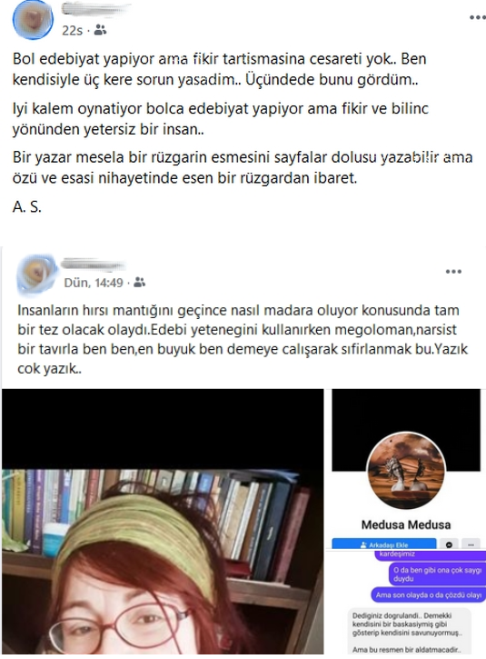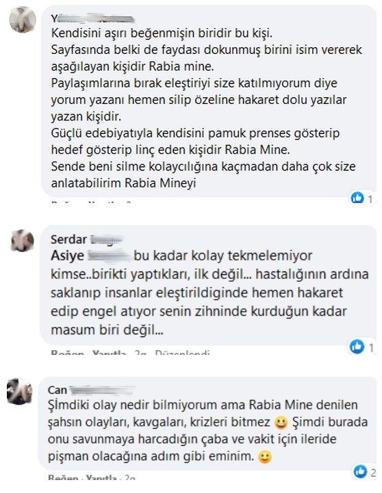 Kendisi bu iddialara şeffaflıkla açıklık getirip tüm banka dekontlarını 'kendi kankası' olmayan tarafsız bir kurula teslim ederek netleştirmek yolunu seçmek yerine yanına herkese ağızlar dolusu küfürler yazan, hakaretler savuran, aşağılayan ama kendisine 'çıt' denildiğinde ağlayıp, sızlayan, mağdur olan, kalbi sıkışan, her defasında hastaneye zor yetiştirilen, her defasında psikolojisi bozulan Kürtlerin, Ermenilerin ve Sosyalistlerin asalağı, bilinçaltı Alevi düşmanlığı deşifre olmuş, her sevmediği ölünün ardından kazma kürekle mezar deşen, Grup Yorum ve sosyal medyadaki tüm HALK CEPHE'lilerle düşman olmuş, KHK'li Yüksel caddesi direnişçisi Nazan Bozkurt'a ağıza alınmadık küfürler yazan Rabia Mine'yi alarak, kuş uçmaz kervan geçmez sosyal medya sayfasında aklınca kendisini temize çıkarma uğraşlarına girdiği bildirildi.