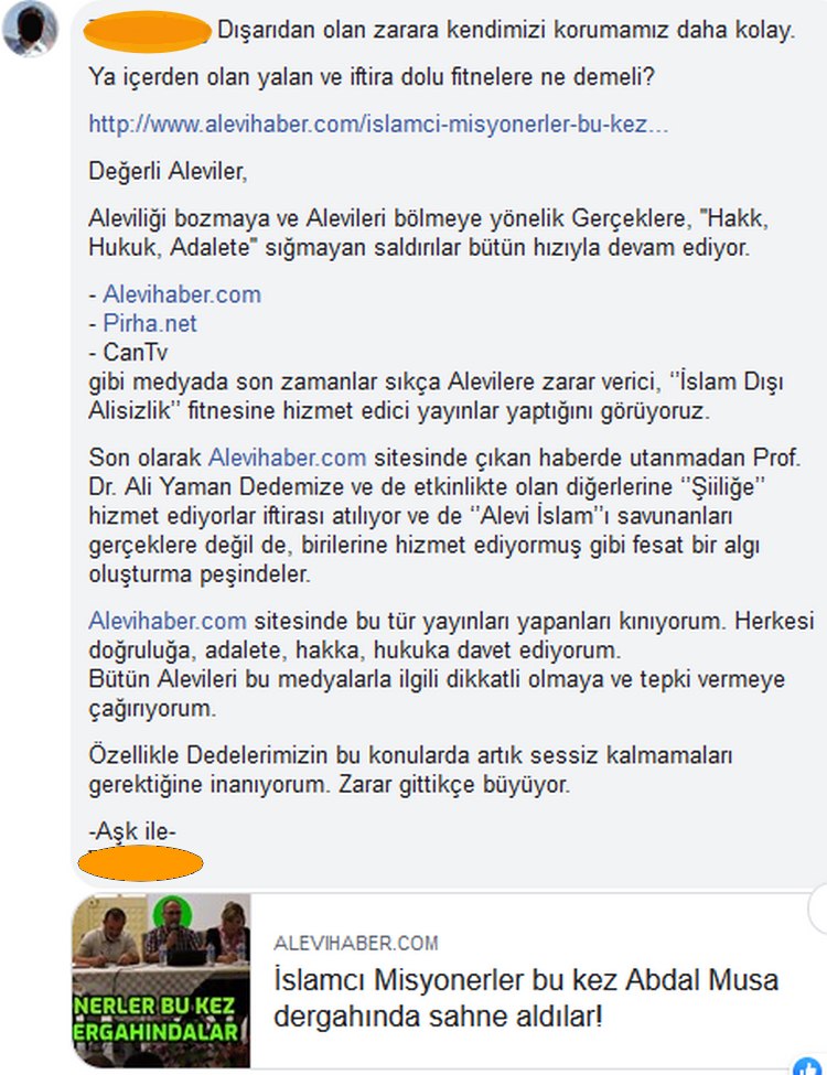 Kısa bir süre evvel haberleştirdiğimiz LA Kitap sahibi Leyla Akgül sosyal medyada Şiacı misyonerler tarafından hedef gösterilen www.alevihaber.com, pirha.net ve Can TV açıklamalarından güç alarak bir Can TV emektarının sosyal medya hesap sayfasında isim vermeden Alevi Haber, pirha ve Can TV'yi hedef alır açıklamalarda bulunarak kimlerin yanında konumlandığını bir kez daha gösterdi.