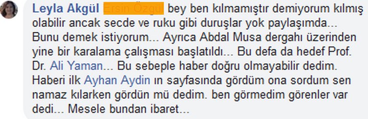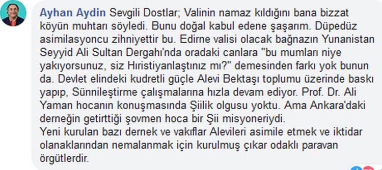 Leyla Akgül'ün utana-sıkıla secde ve rükulu argümanlarla reddetmeye çalıştığı Valinin namaz kılma durumuyla ilgili kendi sosyal medya hesabından bir açıklama yapan Ayhan Aydın '' Sevgili Dostlar; Valinin namaz kıldığını bana bizzat köyün muhtarı söyledi. Bunu doğal kabul edene şaşarım. Düpedüz asimilasyoncu zihniyettir bu. '' diyerek Vali beyi aklama telaşına düşen zihniyete gerekli cevabı verdi.