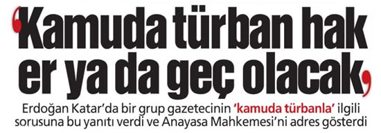 Başbakan Recep Tayyip Erdoğan, özel uçağıyla Katar’a götürdüğü gazetecilere önceki gün yaptığı açıklamada önemli mesajlar verdi. Başbakan, “Bireysel başvuruyla başörtüsünde yeni bir süreç başlayacak” diyerek, kamuda da türbana yeşil ışık yaktı.