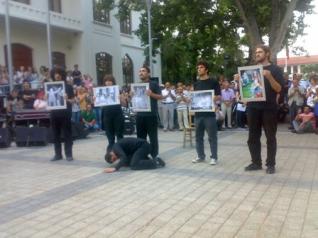 soL (HABER MERKEZİ) Bursa’da Alevi ve Bektaşi Derneklerinin, sendikaların ve siyasi partilerin 2 Temmuz Sivas katliamı dolayısıyla organize ettikleri mitingde sahne alan Kayıp Sahne Sanat Grubu “Bana Bu Karede Yer Açın” adlı oyunu sahneledi.