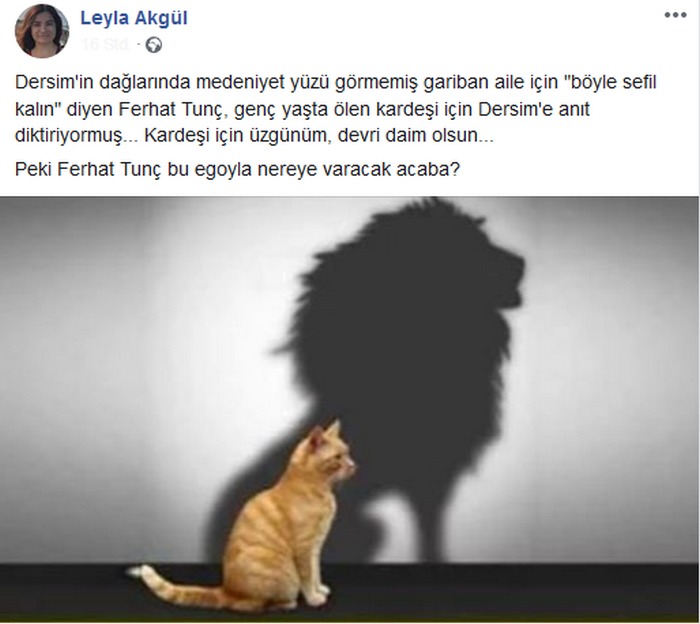Devrimcilere olan alerjisiyle tanınan ve kısa bir süre evvel hakkında sosyal medyaya düşen Avusturyadan İŞİD'e katılan Dersimli bir genç üzerinden Dersim kimliğine saldıran LA Kitap sahibi Leyla Akgül bu kez bir başka Dersimli olan sanatçı Ferhat Tunç'u hedef aldı.