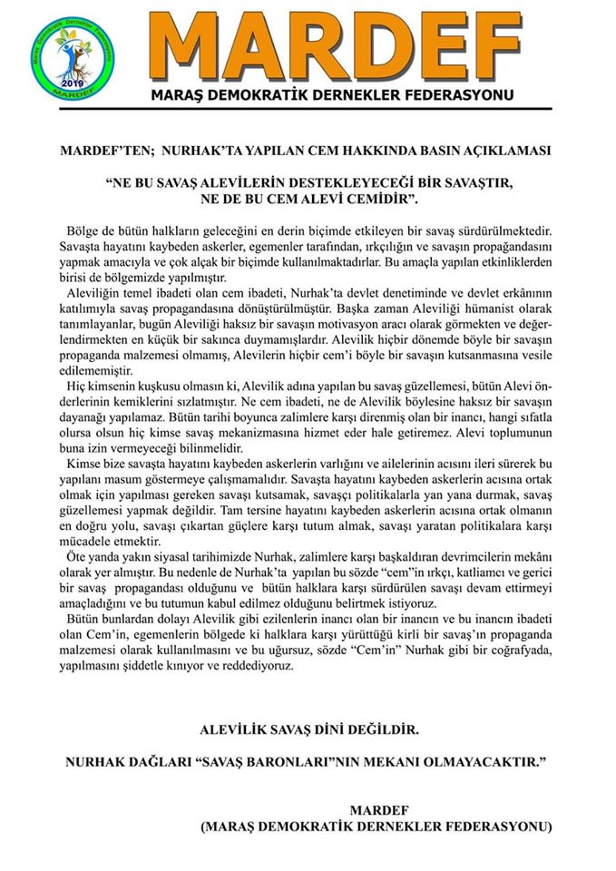 Bütün bunlardan dolayı Alevilik gibi ezilenlerin inancı olan bir inancın ve bu inancın ibadeti olan Cem’in, egemenlerin bölgede ki halklara karşı yürüttüğü kirli bir savaş’ın propaganda malzemesi olarak kullanılmasını ve bu uğursuz, sözde “Cem’in” Nurhak gibi bir coğrafyada, yapılmasını şiddetle kınıyor ve reddediyoruz.