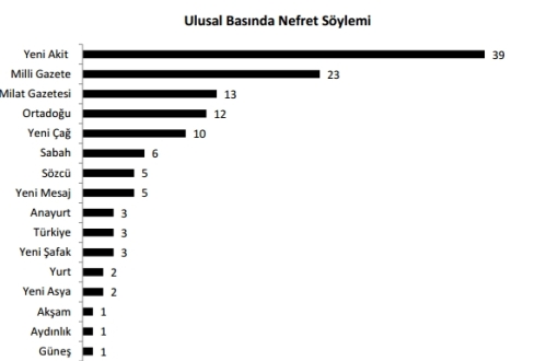 * Nefret söylemine en fazla rastlanan ulusal gazeteler arasında ilk sırada yine Yeni Akit (39 yayın) yer aldı. Yeni Akit’i 23 yayınla Milli Gazete, Milat gazetesi (13), Ortadoğu gazetesi (12), Yeni Çağ (10), Sabah (6), Sözcü (5), Yeni Mesaj (5), Anayurt (3), Türkiye (3), Yeni Şafak (3), Akşam (1), Aydınlık (1), Güneş (1), HaberTürk (1), Milli İrade (1), Önce Vatan (1) ve Sol (1) izledi.