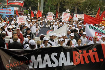 Demirdizen sağlık örgütlerinin taleplerini şöyle sıraladı; “İflas eden ve sağlığa zarar veren Sağlıkta Dönüşüm Programı’ndan vazgeçilerek, Sosyal Sigortalar ve Genel Sağlık Sigortası Yasası iptal edilmelidir. Sağlık işletmelerini ve piyasaya ucuz iş gücü teminini düzenleyen ve Mecliste bekleyen ‘Kamu Hastane Birlikleri ve Tam Gün’ torba yasa tasarısı geri çekilmelidir, bütün vatandaşların ilaç dahil sağlık harcamaları genel bütçeden karşılanmalı, katkı payı, ilave ücret, fark ücreti ve benzeri bütün ek ödemeler kaldırılmaladır, sağlıktaki bütün fark uygulamalarına son verilmeli, nüfus cüzdanı olan her vatandaş her türlü sağlık hizmetinden eşit ve ücretsiz olarak yararlanmalıdır, koruyucu sağlık hizmeti öncelenmeli ve sevk sistemi hayata geçirilmelidir. Aile Hekimliği uygulamasına son verilerek sağlık ocakları insan gücü ve araç gerek yönünden güçlendirilmelidir, tüm sağlık emekçileri kadroya geçirilerek, iş güvencesi sağlanmalıdır, ücretlerimiz kalıcı ve güvenceli olarak iyileştirilmeli, emekliliğimize yansıtılmalıdır.”