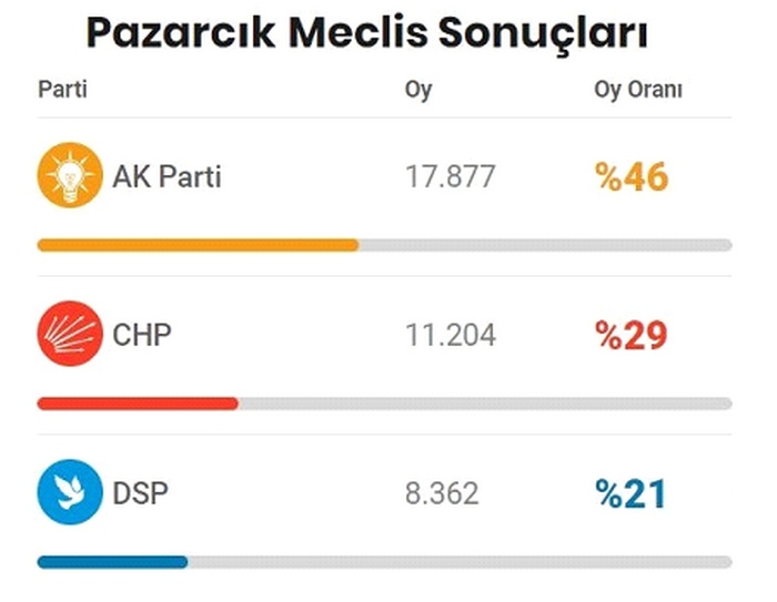 Pazarcık’ta oyların %45’ni alan AKP adayı İbrahim Yılmazcan yerel seçimlerde ilk sırayı alırken, HDP’nin desteklediği millet ittifakından CHP Belediye Başkan adayı Haydar İkizer %27, Eski Pazarcık Belediye Başkanı DSP adayı Kamil Dalkara ise oyların %25’ni aldı. CHP ve DSP toplamda AKP’yi geçmelerine rağmen birbirlerinin oylarını bölmesiyle belediye başkanlığı iktidar partisine bırakıldı.