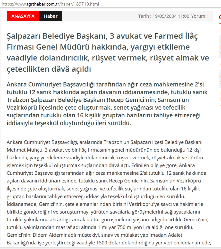 Ankara Cumhuriyet Başsavcılığı, aralarında Trabzon'un Şalpazarı ilçesi Belediye Başkanı Mehmet Muhçu, 3 avukat ve bir ilâç firmasının genel müdürünün de bulunduğu 12 kişi hakkında, yargıyı etkileme vaadiyle dolandırıcılık, rüşvet vermek, rüşvet almak ve cürüm işlemek için teşekkül oluşturmak suçlarından dâvâ açtı. Edinilen bilgiye göre, Ankara Cumhuriyet Başsavcılığı tarafından ağır ceza mahkemesine 2'si tutuklu 12 sanık hakkında açılan davanın iddianamesinde, tutuklu sanık Recep Gemici'nin, Samsun'un Vezirköprü ilçesinde çete oluşturmak, senet yağması ve tefecilik suçlarından tutuklu olan 16 kişilik gruptan bazılarını tahliye ettireceği iddiasıyla teşekkül oluşturduğu ileri sürüldü. İddianamede, Gemici'nin, çete elemanlarından birisini Vezirköprü'ye savcı ve hakimlerle birlikte gönderdiğini ve soruşturmayı yürüten savcılarla görüşmelerini sağlayacaklarını tutuklu yakınlarına aktardığı, ancak bu tür görüşmelerin yaşanmadığı belirtildi. Gemici'nin, tutuklu yakınlarından masraf adı altında 1 milyar 750 milyon lira aldığı öne sürüldü. Gemici'nin, Didem Aldemir adlı müştekiyi, sınav ve mülakat yapılmadan Adalet Bakanlığı'nda işe yerleştireceği vaadiyle 1500 dolar dolandırdığına yer verilen iddianamede, ayrıca, ilaç firması Farmed'in Sağlık Bakanlığı İlaç Eczacılık Genel Müdürlüğü nezdindeki ruhsat işlemlerini Genel Müdür Yardımcısı Nuray Taşçı'nın adını kullanarak komisyon karşılığı sonuca bağlayacağı vaadinde bulunduğu ifade edildi. İddianamede, Ankara Barosu avukatlarından Ali Timurtaş Özmen'in, Niksar Asliye Ceza Mahkemesi tarafından yürütülen soruşturmada bilirkişi olarak belirlenen Ankara Asliye Ceza Mahkemesi'nden, 7.5 milyar lira karşılığında suç unsuru olmadığına yönelik rapor alacağına ilişkin Gemici ile temas kurduğu anlatılan iddianamede, ancak Özmen'in bilirkişilerle herhangi bir temas kurmadığının belirlendiği kaydedildi. İddianamede, Özmen'in, Gemici ile Vezirköprü'deki tutukluların tahliyesini sağlayabileceği yönünde görüşme yaptığı da anlatılarak, bu iş karşılığı avukatın hesabına 350 milyar lira ve 200 bin dolar yatırıldığı, ancak tahliyelerin gerçekleşmemesi üzerine paranın iade edildiği belirtildi. İddianamede, sanığın soruşturmayı yürüten savcı ve hakimlerle herhangi bir görüşmesinin de tespit edilemediğinin altı çizildi. İddianamede, avukat Türkay Uludağ'ın tutukluların tahliyesi konusunda Gemici ile görüştüğü, avukat Hasan Basri Kürüm'ün ise Niksar Asliye Ceza Mahkemesi'nin soruşturmasıyla ilgili olumlu bilirkişi raporu için 9 milyar lira talep ettiği öne sürüldü. Farmed Genel Müdürü Necmettin Genç'in ise Sağlık Bakanlığı İlaç ve Eczacılık Genel Müdürlüğü'ne sundukları ''Adiovan'' ilacının 2 ve 4 miligramlık dosyalarının değiştirilmesi için şirket elemanı İlker Çimenler'i, talep gelmesi halinde görevlilere rüşvet vermesi için görevlendirdiği ifade edilen iddianamede, tutuklu sanık Çimenler ile İlaç ve Eczacılık Genel Müdürlüğü'nde memur olarak çalışan İkbal Demet Kozanoğlu'nun sorguları sonucunda, 4 milyar lira rüşvet verildiğinin belirlendiği savunuldu. İddianamede, Trabzon'un Şalpazarı ilçesi Belediye Başkanı Mehmet Muhçu'nun ise Niksar'daki soruşturmayla ilgili olarak sanıklar yönünden olumlu bilirkişi raporu alınması için Gemici ile irtibat kurduğuna yer verildi. Muhçu'nun, Gemici'yi telefonla arayarak, 15 milyar ya da 15 bin doların hesabına yatırıldığını söylediği ifade edilen iddianamede, Gemici'nin de savunmasında, bu paranın rapor için kaparo olarak alındığını ifade ettiği kaydedildi. Diğer sanıklar Hanifi Ekinci, Murat Yıldırım ve Mahmut Türk'ün, tahliye işlemiyle ilgili olarak çete içinde faaliyet gösterdikleri belirtildi. İddianamede, çetenin lideri olduğu öne sürülen Recep Gemici hakkında, Türk Ceza Kanunu'nun (TCK) ''dolandırıcılık'', ''dolandırıcılığa eksik teşebbüs'', ''devlet memurlarının adını kullanarak menfaat sağlama'' ve ''cürüm işlemek için teşekkül oluşturma'' suçlarından 4 yıldan 13 yıla kadar ağır hapis cezası talep edildi. Avukat Ali Timurtaş Özmen'in 3 ayrı eyleminden dolayı ''dolandırıcılığa eksik teşebbüs'' ve ''cürüm işlemek için teşekkül oluşturmak'' suçlarından 2 yıl ile 5 yıl arasında değişen ağır hapsi istenen iddianamede, avukat Türkay Uludağ için tutukluların tahliyesi vaadiyle ilgili olaya karıştığı gerekçesiyle TCK'nın 313/1. maddesinde tanımlanan ''cürüm işlemek için teşekkül oluşturmak'' suçundan 1 yıldan 2 yıla kadar ağır hapis cezası ve diğer avukat Hasan Basri Kürüm hakkında, bilirkişi raporuyla ilgili ''dolandırıcılığa eksik teşebbüs'' suçunu işlediği gerekçesiyle 6 ay ile 1.5 yıl arasında ağır hapis cezası talep edildi. İddianamede, Farmed Genel Müdürü Necmettin Genç ve firma çalışanı İlker Çimenler hakkında, TCK'nın ''rüşvet vermek'' başlıklı 213. maddesi uyarınca 12'şer yıla kadar ağır hapis ve memuriyetten ömür boyu men, İlaç ve Eczacılık Genel Müdürlüğü görevlisi İkbal Demet Kozanoğlu hakkında da TCK'nın ''memurun rüşvet alması'' suçunu tanımlayan 212/1. maddesi uyarınca 4 yıldan 12 yıla kadar ağır hapis ve memuriyetten ömür boyu men cezası talep edildi. Şalpazarı Belediye Başkanı Muhçu hakkında ''dolandırıcılığa eksik teşebbüs'' suçundan 6 ay ile 1.5 yıl arasında ağır hapis cezası talep edilen iddianamede, diğer 4 sanık hakkında da 6 ay ile 3.5 yıl arasında değişen hapis cezaları istendi.