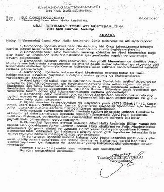 Hatay ili Samandağ ilçesi Alevi halkı kesiminin 2010 tarihinde ilk altı aylık raporu adı altında düzenlenen sahte belgede, Alevi halkının dinsiz olduğu, Namaz kılmak için camiye gitmediği, Alevi muhtar ve dedeler hakkında soruşturma açıldığı, Samandağ Beldesinde bulunan Alevi İşadamların bulunup çökertme girişimi yapılması, yeni dönemde tüm Alevi kesiminin yüzde 90'nın fişleneceği yazılıyor.