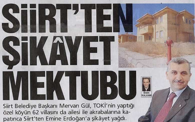 Siirt Belediye Başkanı Mervan Gül, TOKİ’nin "Tarım Köy Projesi"ni ailesine özel köy yaptırmakta kullandı. Mervan Gül’ün doğum yeri Bostancık’ta yapılan üçer katlı 62 konuttan 40’ı aynı soyadı taşıyan kişilere satıldı. 17’sini Mervan Gül’ün anne tarafından yakını olan Tekin’ler aldı. Diğer konutlar da damatlara gitti.