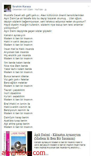 Mustafa Ceceli'nin Aşık Daimi'ye ait eserin bazı bölümlerini bozarak okuduğunu belirten Şair İbrahim Karaca, "Mustafa Ceceli adlı gafil şarkıcı; Alevi kültürünün önemli temsilcilerinden Aşık Daimi'ye ait felsefe dolu bu deyişi bozarak okumuş..." diye yazdı.